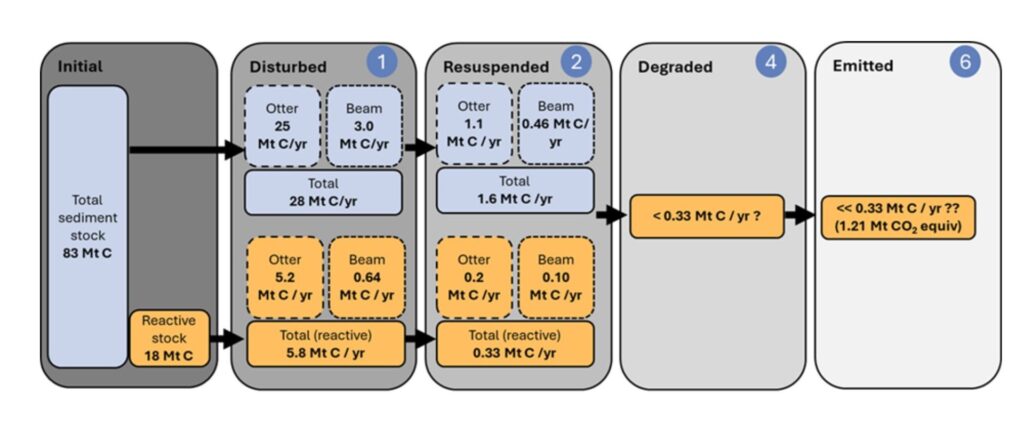 This matters considerably. Although this number is still significant, for years, studies often assumed all carbon disturbed by trawling gear entered the water column. The developing evidence now shows that depending on gear type, between 1% and 21% of disturbed carbon is resuspended into the water column. Furthermore, depending on the seabed type, not all resuspended carbon is reactive enough to degrade, only between 10 and 35% of the seabed carbon is classed as being ‘reactive’.